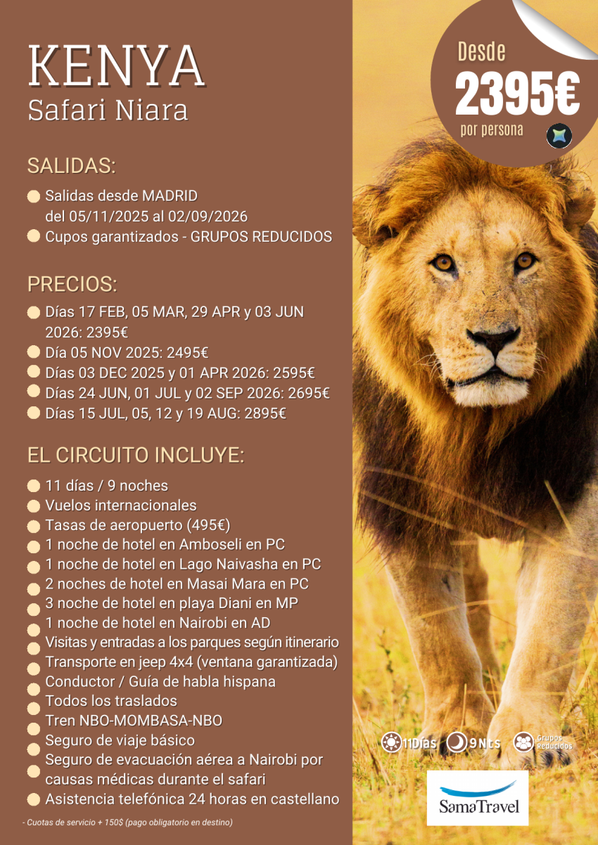 KENYA "Safari Niara+Playa": 11 días con Amboseli, Lago Naivasha, Masai Mara, playa Diani, Nairobi, *dsd 2395€*