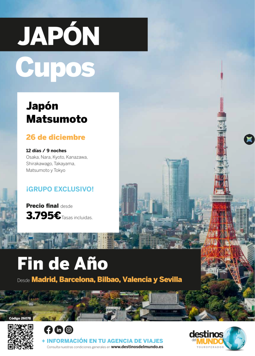 🏯🇯🇵🎉FIN DE AÑO Japón Matsumoto CUPOS 12 días / 9 noches salidas: 26 diciembre 2026 desde 3.795€ 🏯🇯🇵🎉